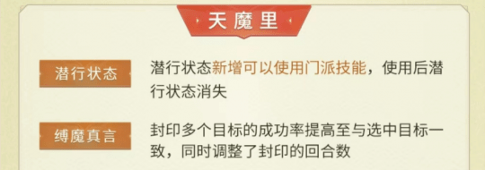 核心改动内容:天魔里在“潜行”状态下可以使用门派技能,但使用技能后潜行状态消失。