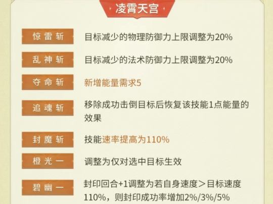 其他门派方面,辅助门派普陀虽整体小削,但神怜苍生改为复活队友并提供1回合魔免新增了一个强势技能,佛门整体大削但因精灵悟增强,实现了与普陀的平衡(精灵悟现在30%气血以下时受回复提升为10%)。