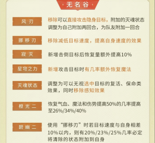 虽然是大削但即使没有感知能力,风刃的无视生存技能效果,仍是十分强势的存在,再通过加强无名谷的自身回血能力,减少无名谷对团队的依赖明确辅助输出的定位,这届策划还是有水平的。