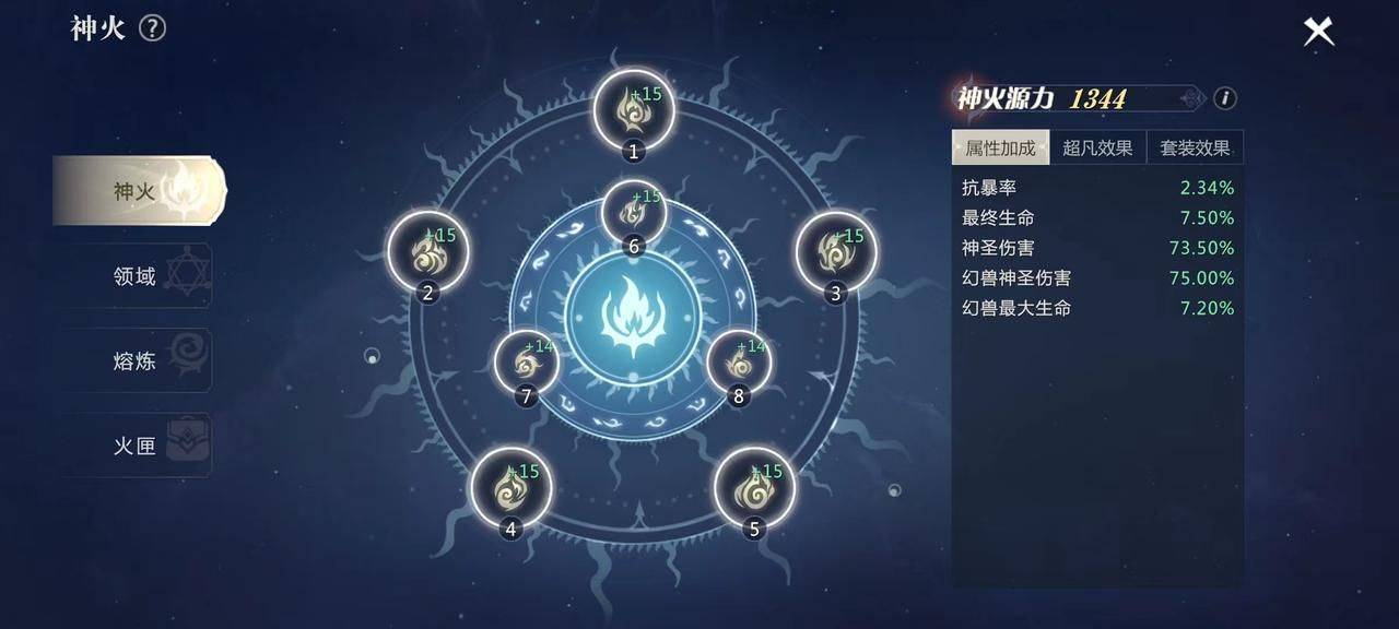 为了进一步提升神火的属性和得分,人们可以通过神火熔炼来进行升级,包括追加、分解、传承、转移、荒古神火、熔炼、炼制和铸印。上古创世神将神火领域划分为多个领域,其中包括薪火、业火和真火,这三重又分为更多的阶层,每个神选者所配备的神火都能提供神火源力,而神火源力也是史上最高的。拥有足够的神纹,可以使神火源力达到更高的水平。