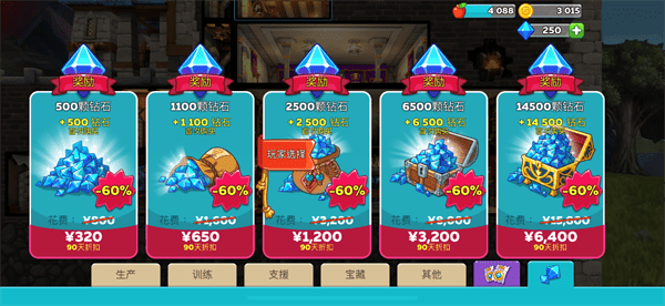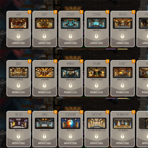 在新手引导的帮助下,玩家围绕着王座室建造各类基础设施,包括餐厅、金库、军营、训练室等,后续随王座室等级解锁更多高级设施,它们主要分为三类:生产、训练、支援。