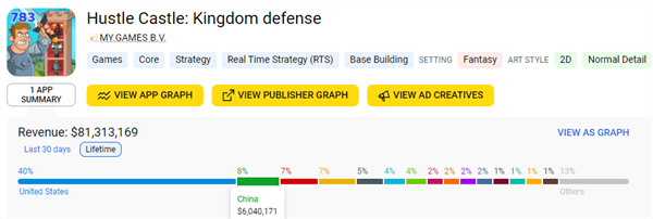 近日,欧洲游戏发行商My.Games在旗下游戏《Hustle Castle》发行六周年之际宣布其下载量超过 8000 万,总收入超过3.67亿美元,日收入峰值曾高达1200万元。