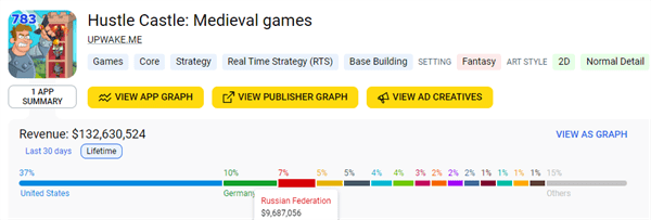 据AppMagic数据显示,收入方面,《Hustle Castle》的双端收入的大头都来自美国,安卓端占37%、iOS端占40%。安卓端前三名为美国、德国、俄罗斯;iOS端前三名为美国、中国和俄罗斯。