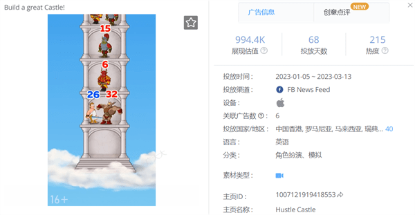 买量方面,据广大大数据显示,《Hustle Castle》的买量范围非常广泛,覆盖全球各大国家和地区,排名前三的为中国香港、英国和爱尔兰;广告投放的平台主要是FB News Feed、Instagram、Messenger和Audience Network。