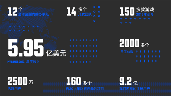 My.Games原是俄罗斯最大的互联网公司Mail.ru推出的全球游戏品牌,而如今官网显示其为一家欧洲发行商和开发商,2022年12月因为一些众所周知的国际因素,对My.Games的发展造成了一定影响,于是该公司宣布退出俄罗斯市场,在俄罗斯产生收入的所有业务部分将分拆为一个新的独立实体,该实体与My.Games无关。现在其总部位于阿姆斯特丹,在旗下十多个开发工作室的协作下继续前进,而目前My.Games在全球拥有超过10亿注册玩家,旗下拥有多款著名游戏,如《War Robots》、《Hustle Castle》、《Rush Royale》、《Left to Survive》、《Warface》等。