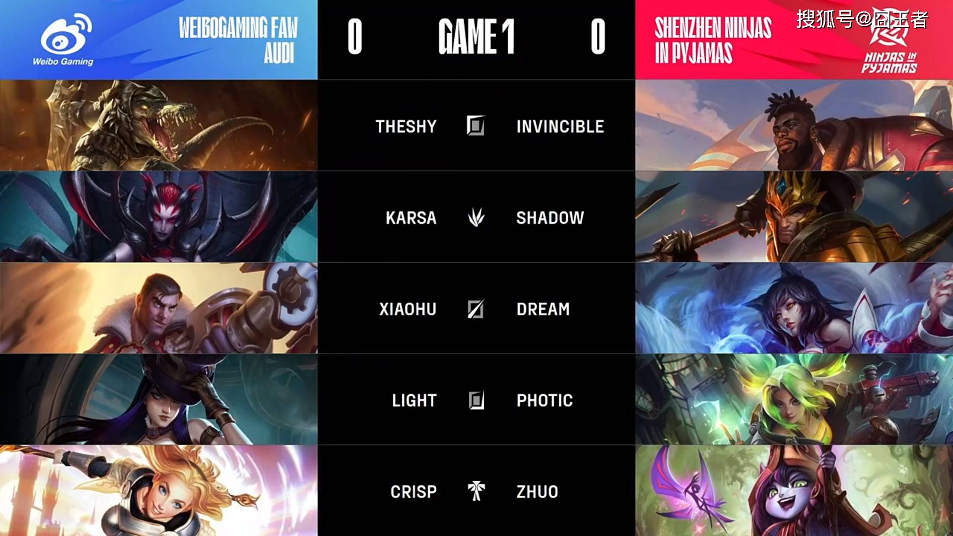 第一局比赛,WBG蓝色方,禁用佛耶戈、大树、韦鲁斯、塞恩、贾克斯,选用鳄鱼、蜘蛛、杰斯、女警、拉克丝;NIP红色方,禁用蔚、盲僧、凯南、纳尔、小炮,选用奎桑提、皇子、阿狸、泽丽、璐璐。