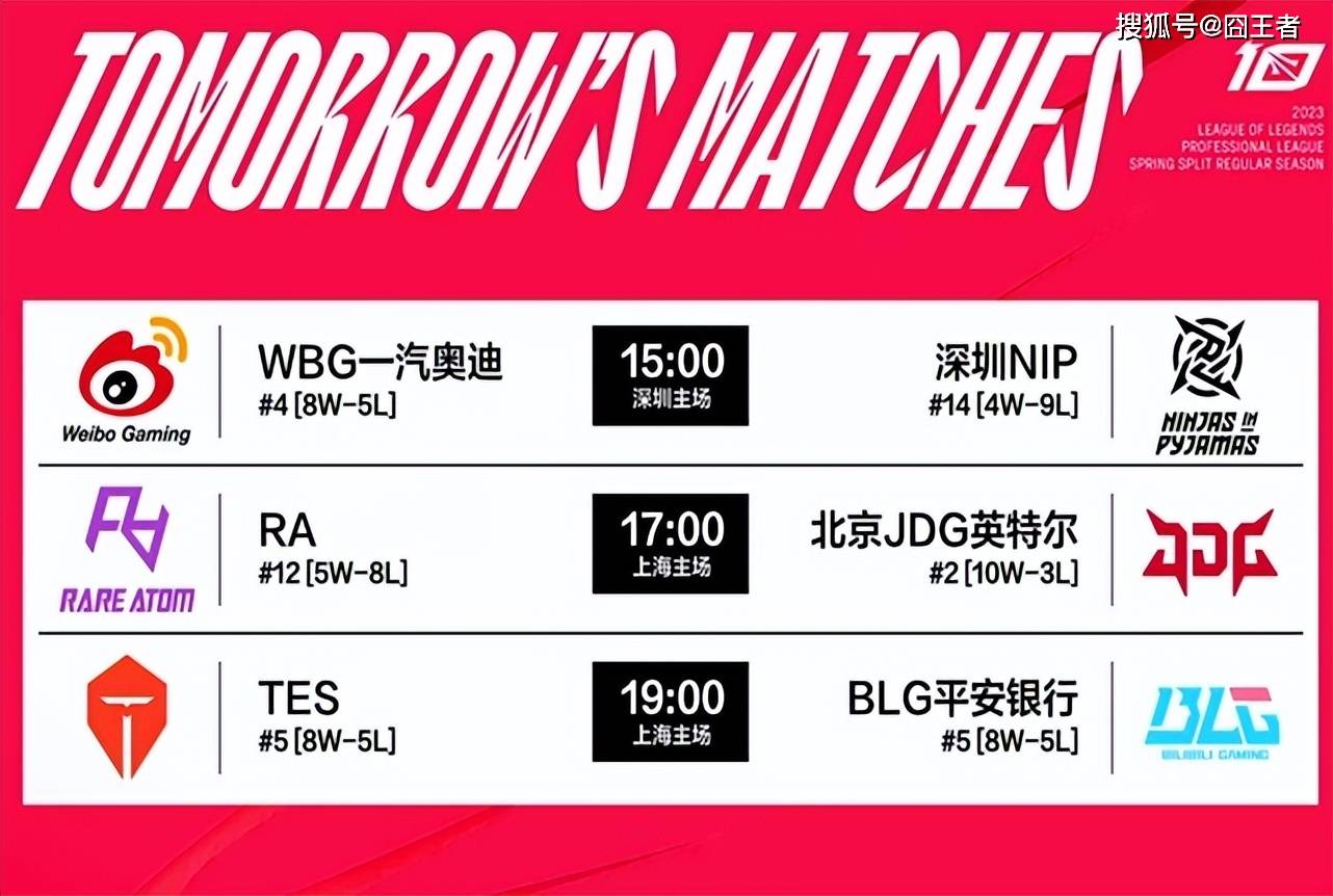 英雄联盟S13春季赛,LPL赛区常规赛赛程,已经接近尾声。有意剑指季后赛,甚至希望拿到MSI门票的队伍(今年MSI咱们可以有两支队伍),全都开启了抢分模式。按照赛程,3月18日超级周末有三场比赛,分别是WBG对阵NIP,RA迎战JDG,以及焦点之战TES大战BLG三场比赛组成!
