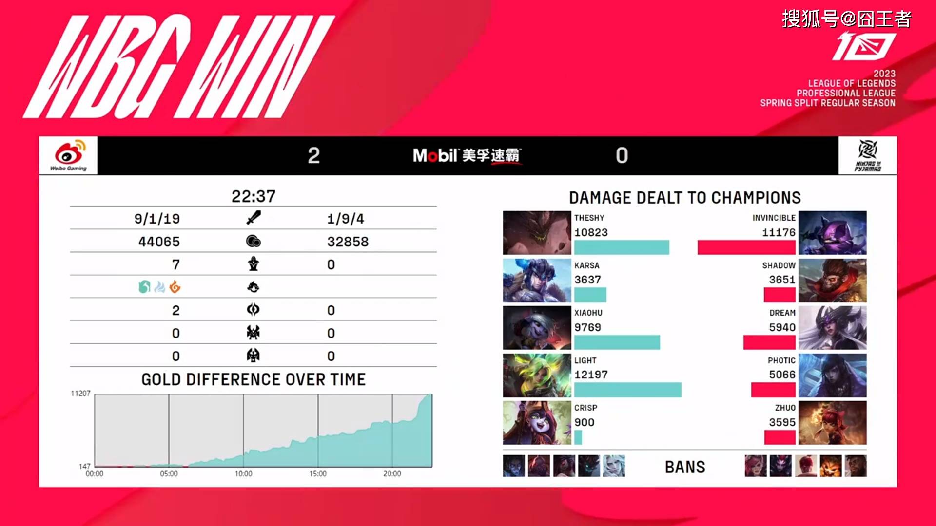 WBG直落两盘,轻松横扫NIP,双方光速下班后。WBG拿到了自己在本赛季的第九个大胜场,这也让WBG成为了继EDG,LNG和JDG之后,第四个锁定季后赛席位的战队。而NIP则是简单轻松的,和黑暗四天王为伍,夏季赛再加油了!