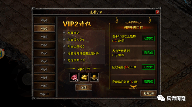 进入游戏后可以找客服领取专属的礼包福利,内含赞助特权绝对号。在主城的万能商人那里可以兑换。特色免费Vip系统,不用花钱,做任务就能升级!