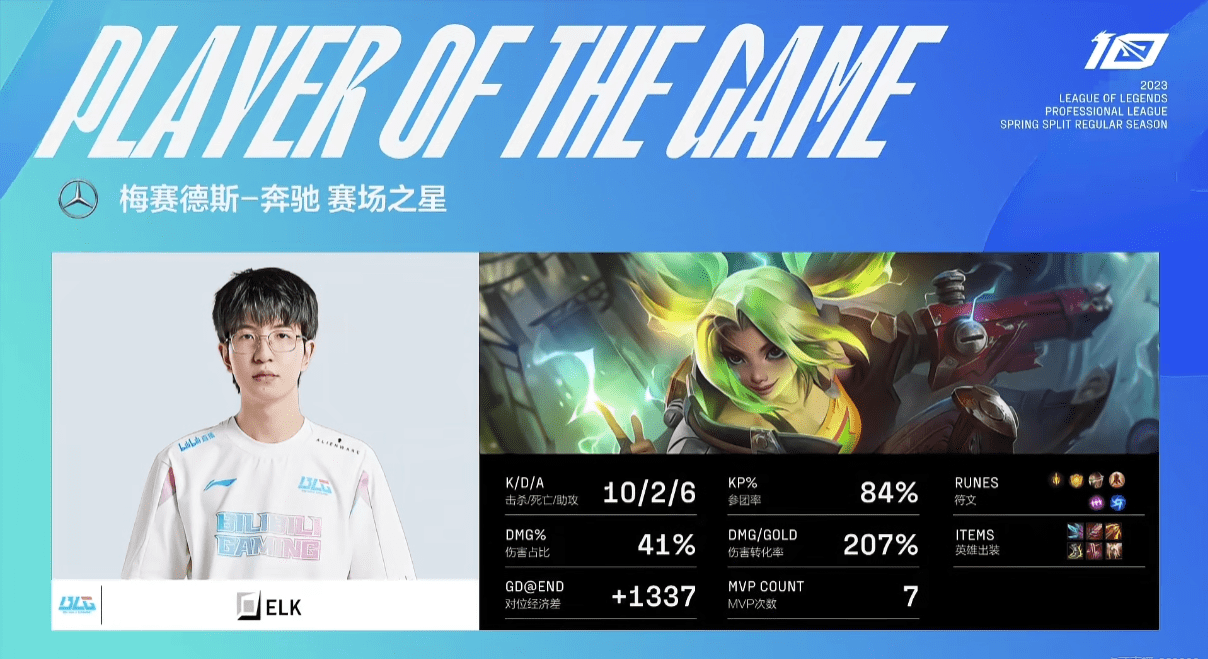 第二局ELK的泽丽继续保持着极高的竞技水准表现,最终拿到了10-2-6,打出了全队41%的输出占比,伤转也是达到了207%,这也是为他赢得了比赛的MVP。而Jackeylove的霞并没有什么太多亮眼发挥。整场比赛TES最让人觉得可惜的是上单Qingtian的塞拉斯,其个人发挥可以说是败方的MVP了。