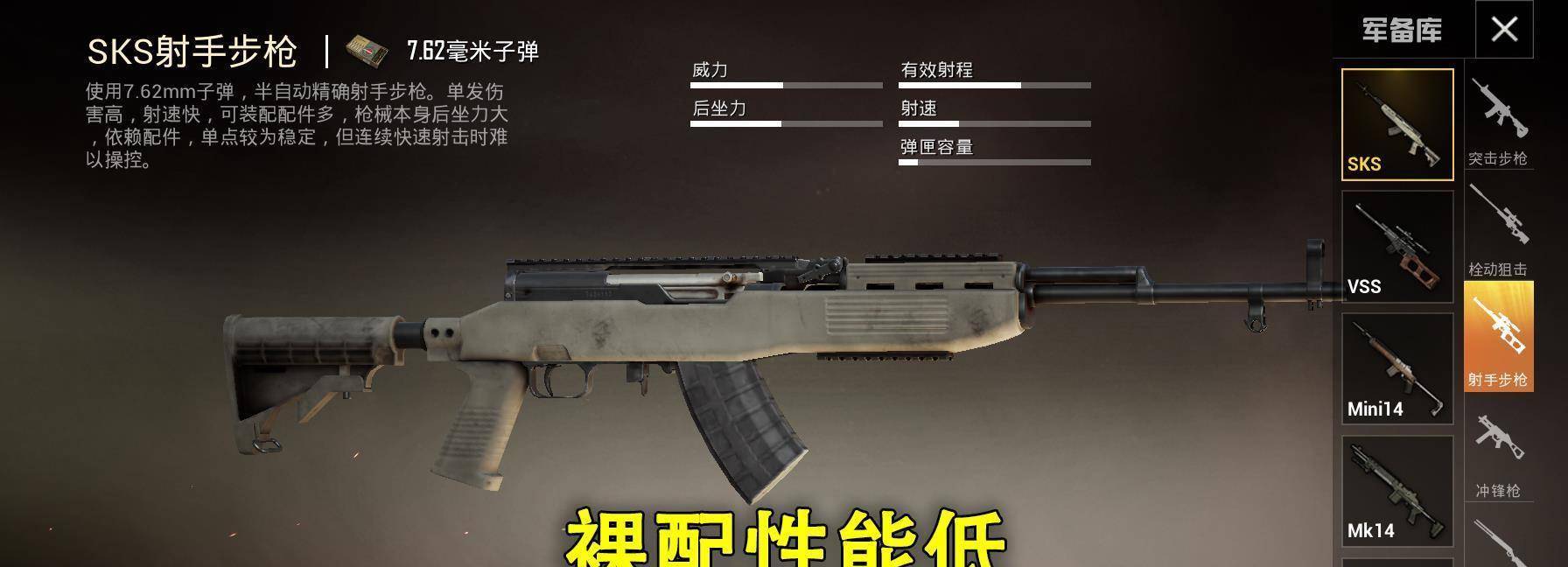 首先就是这个新手非常喜欢的狙击SKS。到现在我基本很少用SKS,看到了也不知道怎么接,因为个人觉得SKS不如AKM的单发狙击。个人感觉不能强加于枪械。客观的说,SKS是一把不错的枪械。配件齐全后,打人真的很稳。不过现在配件太难找了,想要全配SKS太难了。基本上,它们都是准系统的SKS。用过的就知道,裸SKS是比较难打敌人的。另外,它本身的伤害也不高。玩家像火棒一样使用它。