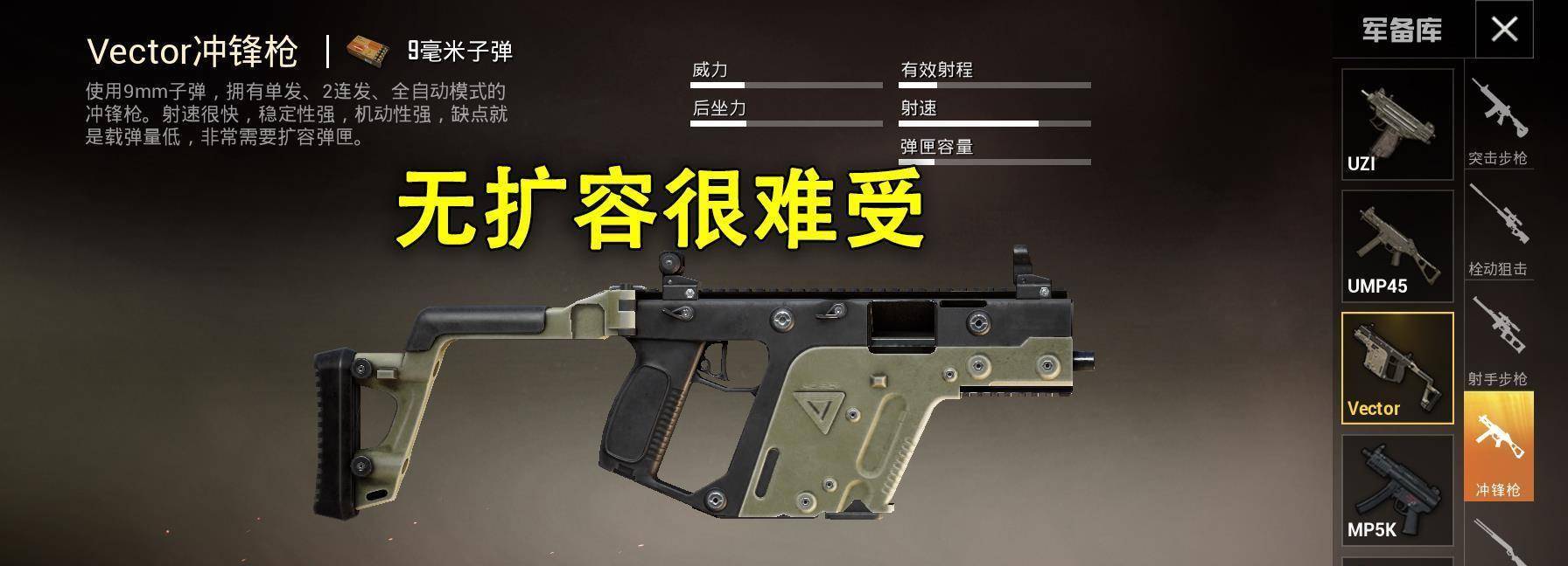 维克多虽然改用了9mm子弹,增加了弹容量,但其缺乏弹头的特性并没有改变。没有展开的维克多,真的就像骑马被马腿绊倒,表现不太好。之前用0.45子弹的时候,维克托的伤害还不错,现在换成9mm后,伤害就降低了。就算子弹容量增加一点点,也打不出以前的效果。所以,没有展开的维克多,实在是有些鸡肋。说它是火棍是一种侮辱,因为它不是很长,不容易燃烧。