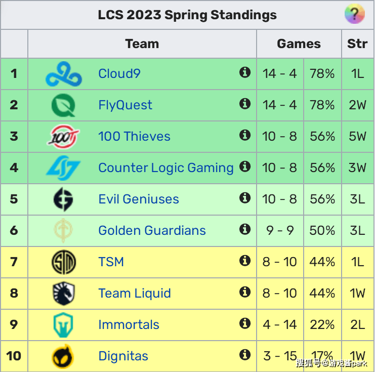 3月18日凌晨,2023北美LCS赛区春季赛常规赛落下帷幕。如下图所示,本赛季春季赛LCS赛区晋级季后赛的6支战队分别是:C9、FLY、100T、CLG、EG,GG。游戏酱park在score数据查询了下,C9和FLY在春季赛常规赛对位互有胜负(bo1赛制)。两队常规赛战绩都是14胜4负,同时都双杀了100T。doublelift还是得尊重下的,毕竟北美幻神嘛。