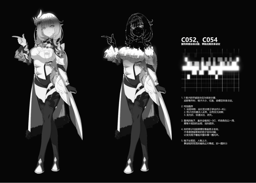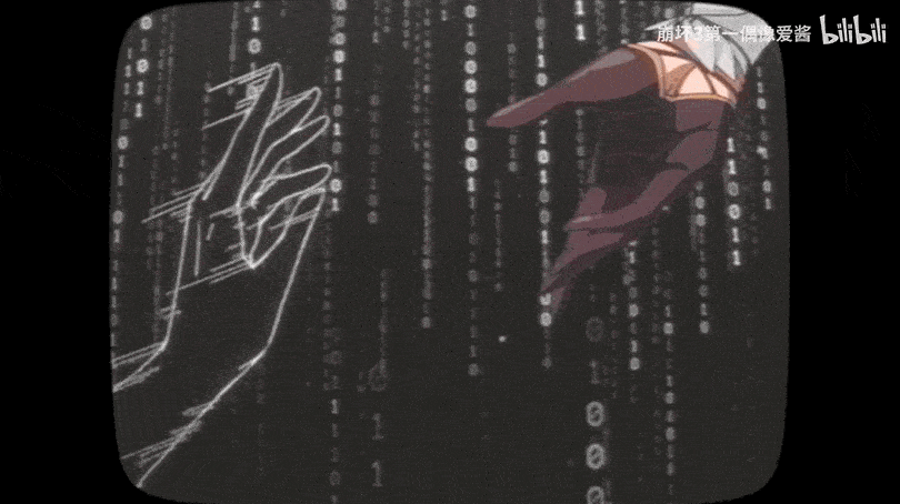 场景设定在数字世界,boss的形象参考了显像管老电视,被boss擒获后,爱莉希雅被“降维打击”成为了数字碎片:一堆由0和1组成的代码——重生过程中,影像风格则从【黑白-显像管电视】经历【赛璐璐-4:3影像】最终变回【高清CG-16:9影像】。 (头脑风暴时他们甚至还想过让爱莉希雅变成白模出现在Maya界面中,当然最终并没有采纳)