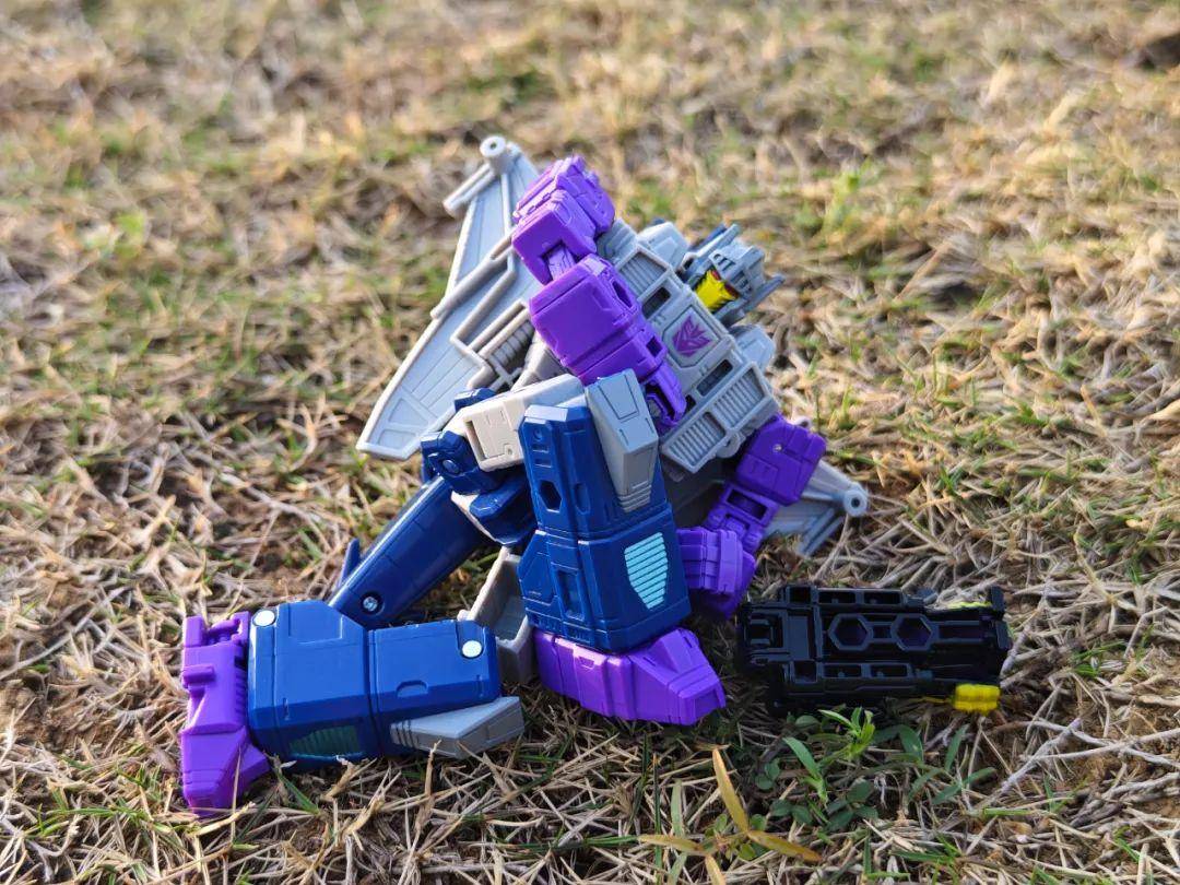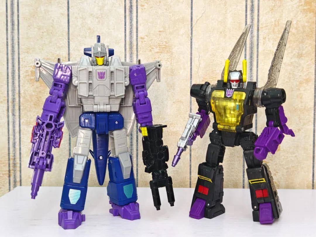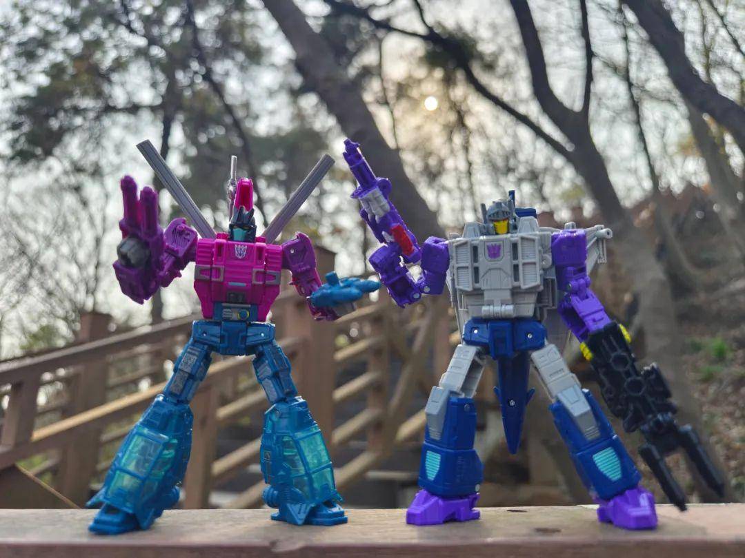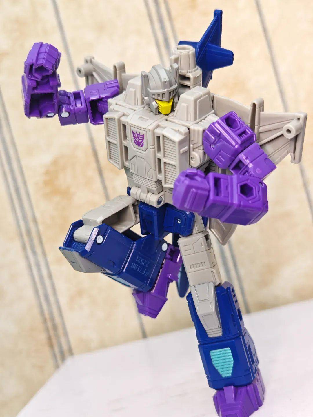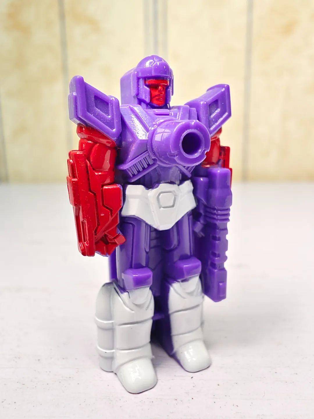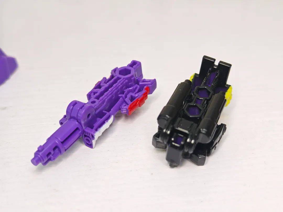 另一位是Zigzag,最合适的翻译可能是锯齿,但已经有霸天虎叫锯齿了,不如叫折线。他是个失败的战士和修理工,变形为双管静电步工具。他身上的黑色不是成型色,完全是涂装,从孔洞深处可以发现他本来就是一块紫色的零件,正因如此,把玩的时候要稍微注意一下掉漆的问题,虽然黑色补色很方便,但肯定不是原来这种光亮的效果了。他身上的甲胄刻画有武士的感觉,一只手臂上装着盾牌。