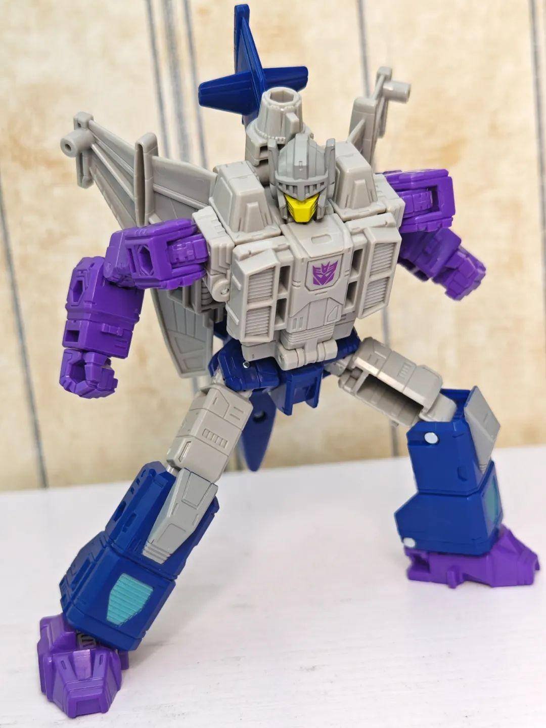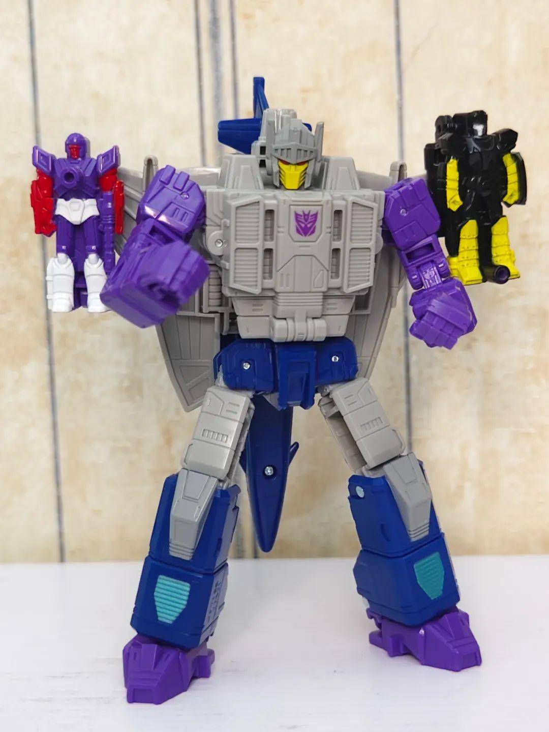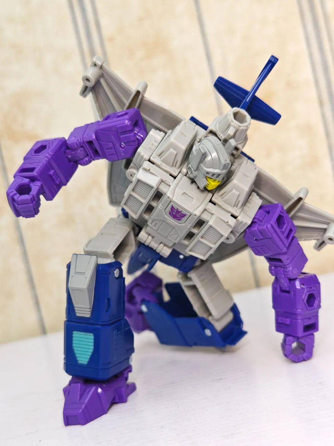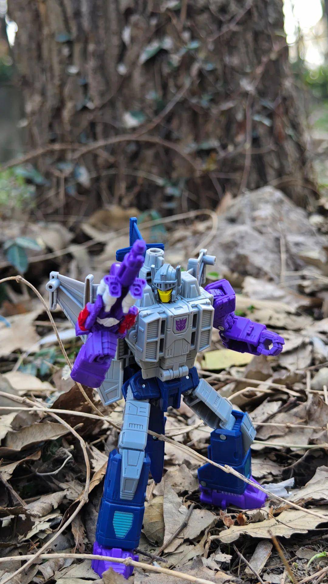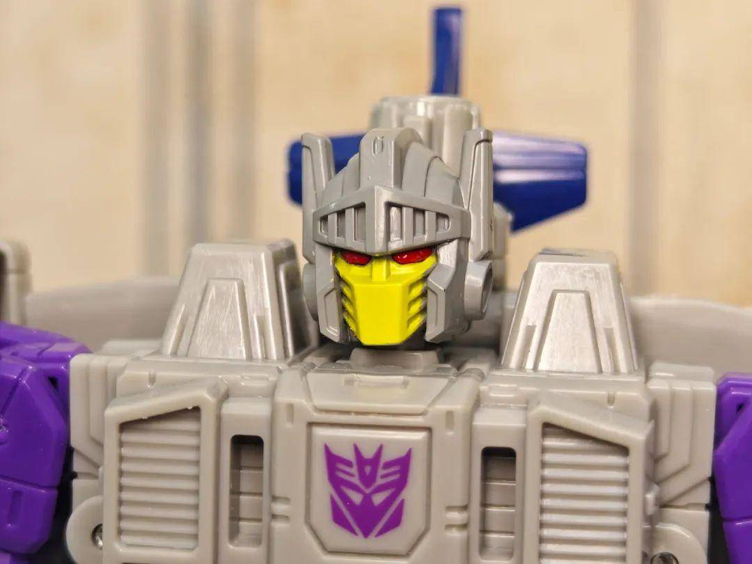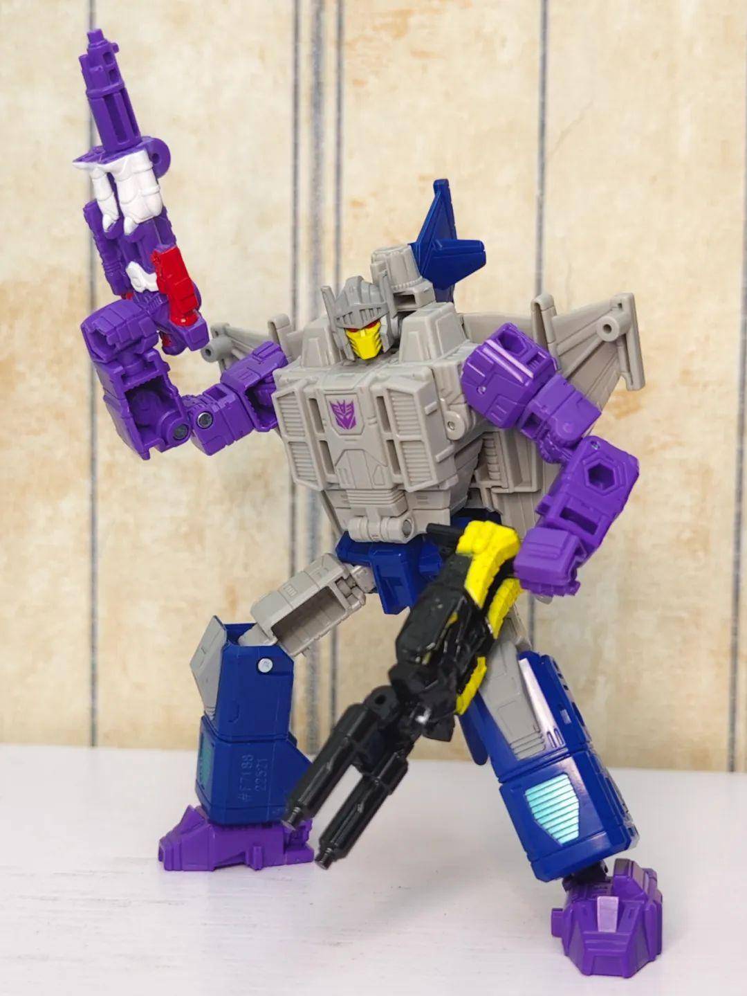 另一位是Zigzag,最合适的翻译可能是锯齿,但已经有霸天虎叫锯齿了,不如叫折线。他是个失败的战士和修理工,变形为双管静电步工具。他身上的黑色不是成型色,完全是涂装,从孔洞深处可以发现他本来就是一块紫色的零件,正因如此,把玩的时候要稍微注意一下掉漆的问题,虽然黑色补色很方便,但肯定不是原来这种光亮的效果了。他身上的甲胄刻画有武士的感觉,一只手臂上装着盾牌。