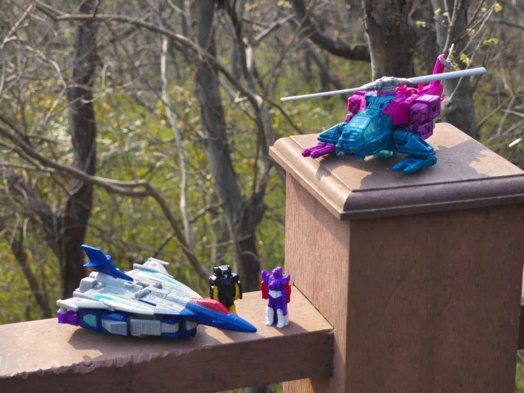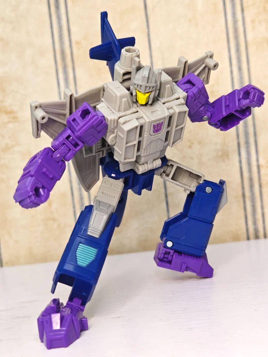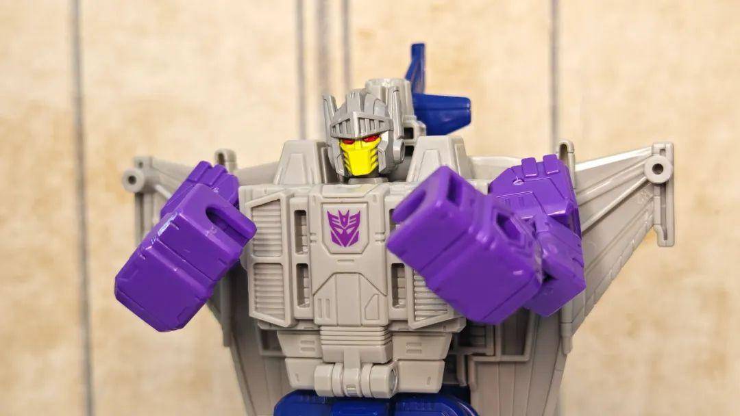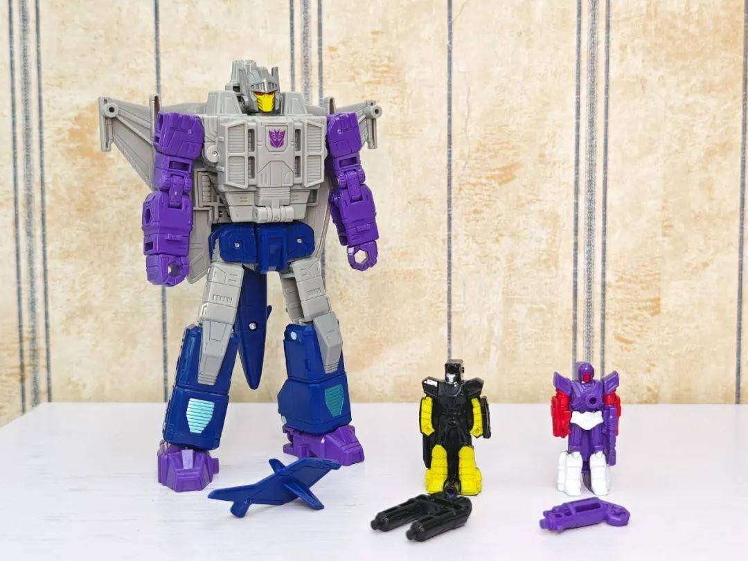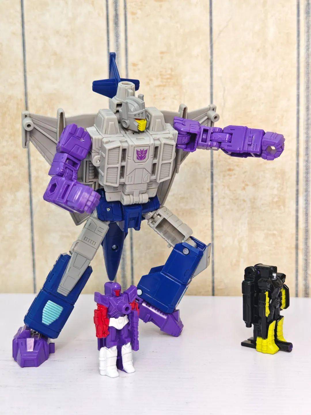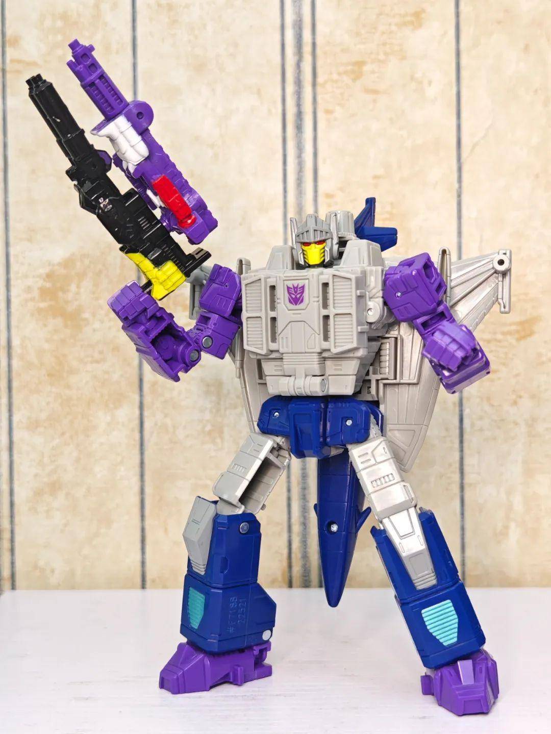 另一位是Zigzag,最合适的翻译可能是锯齿,但已经有霸天虎叫锯齿了,不如叫折线。他是个失败的战士和修理工,变形为双管静电步工具。他身上的黑色不是成型色,完全是涂装,从孔洞深处可以发现他本来就是一块紫色的零件,正因如此,把玩的时候要稍微注意一下掉漆的问题,虽然黑色补色很方便,但肯定不是原来这种光亮的效果了。他身上的甲胄刻画有武士的感觉,一只手臂上装着盾牌。