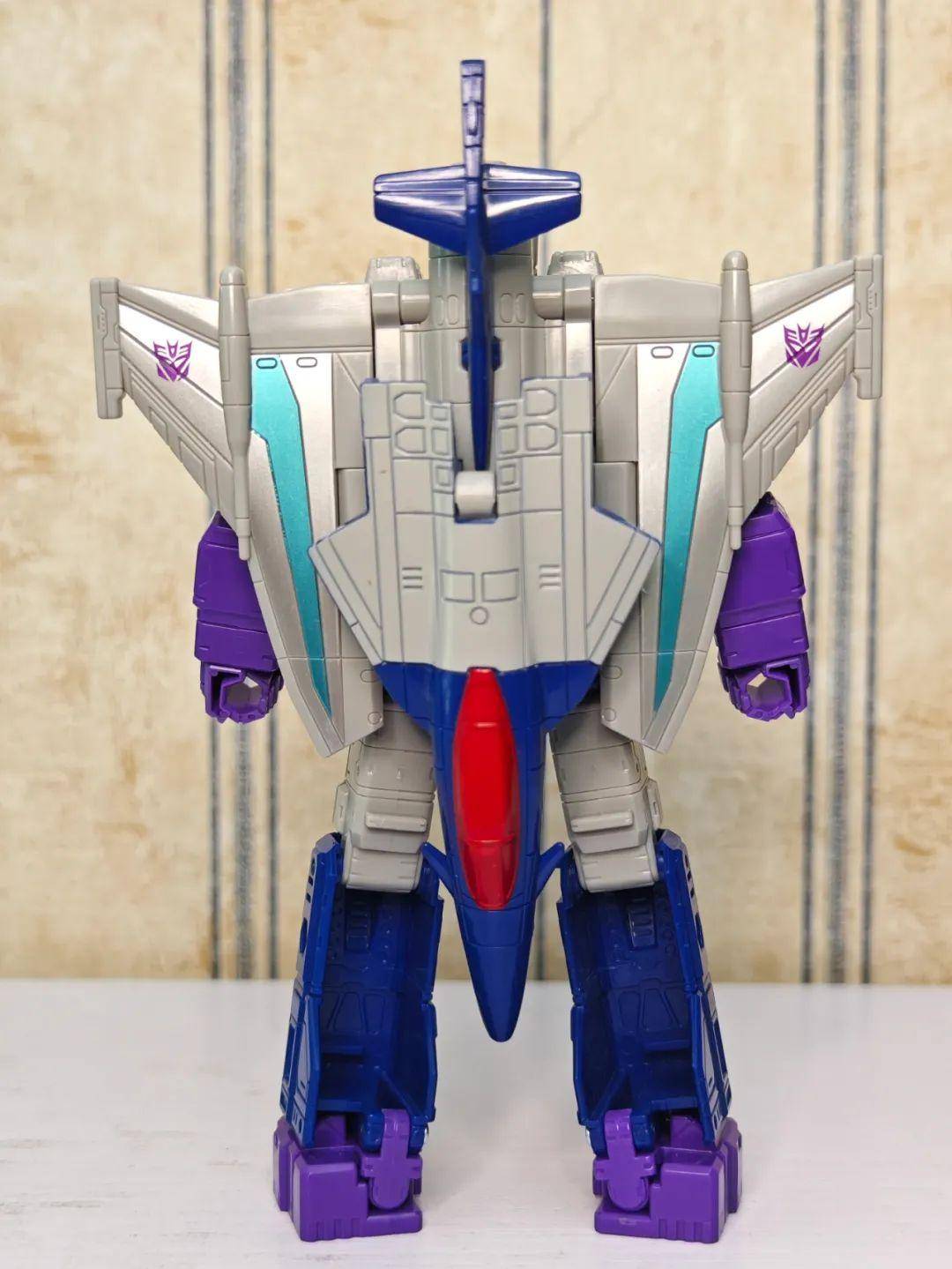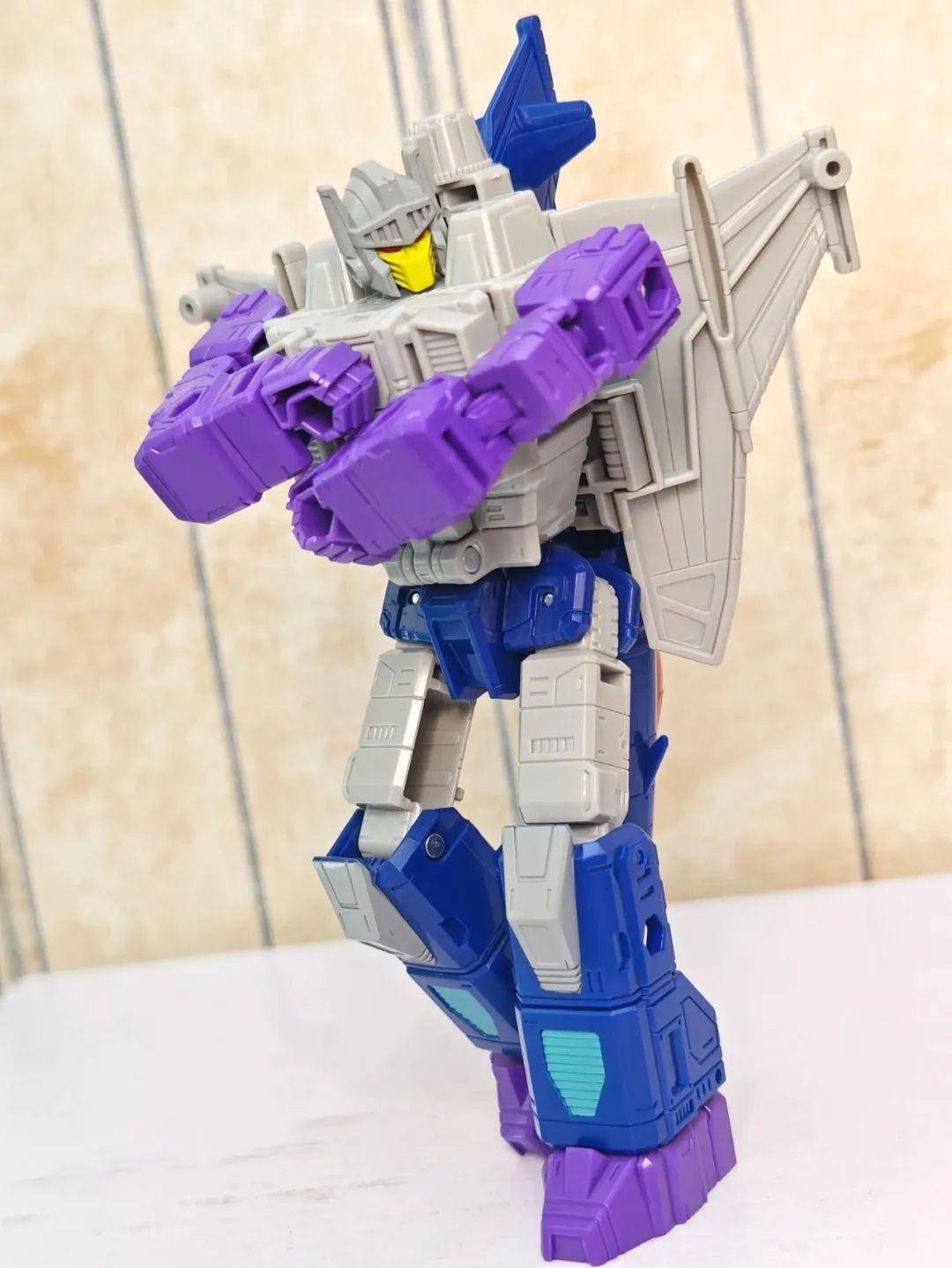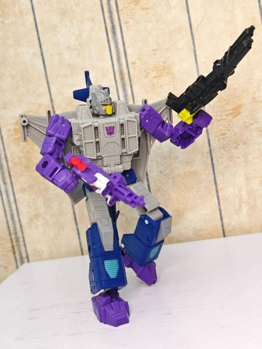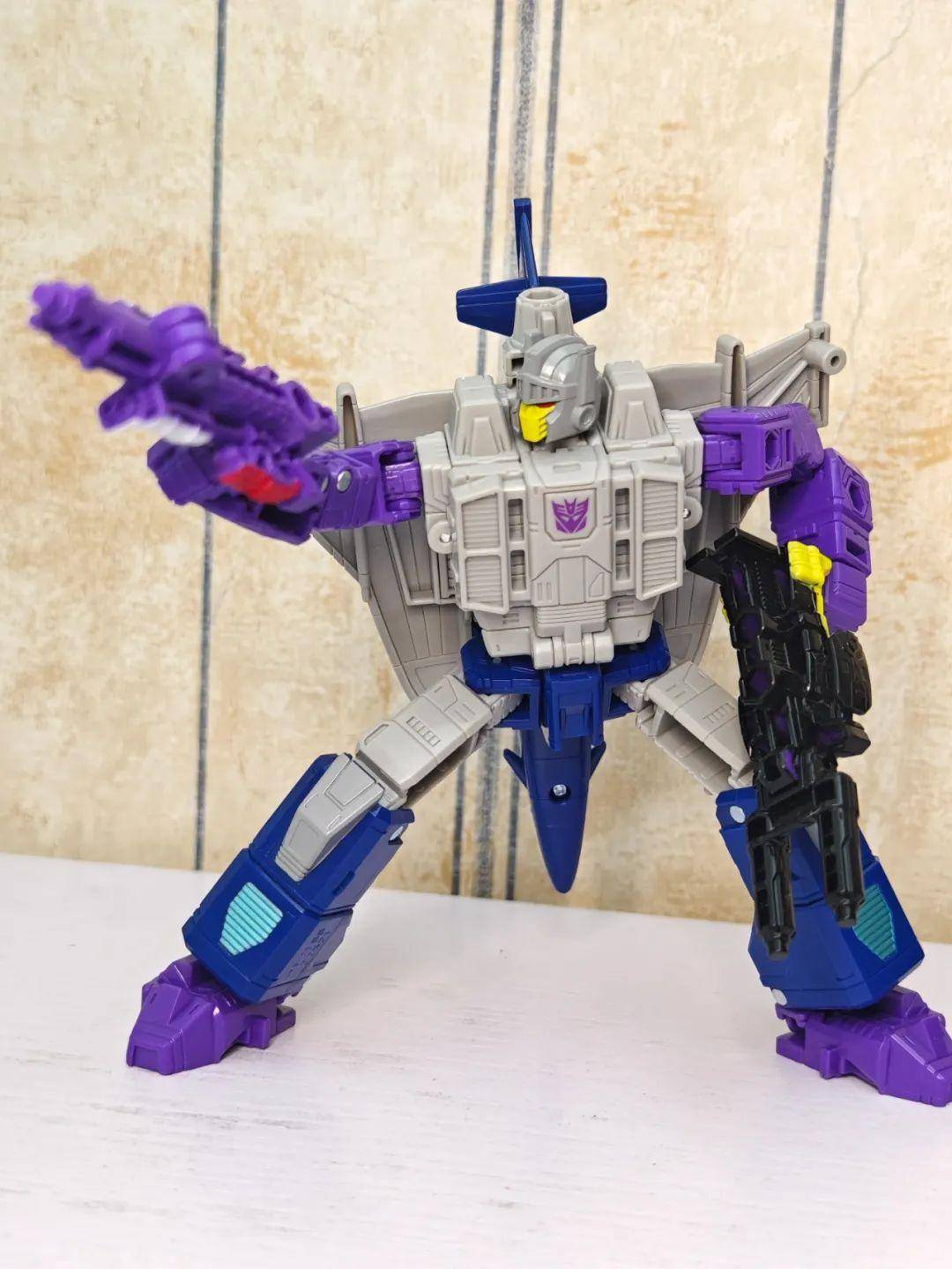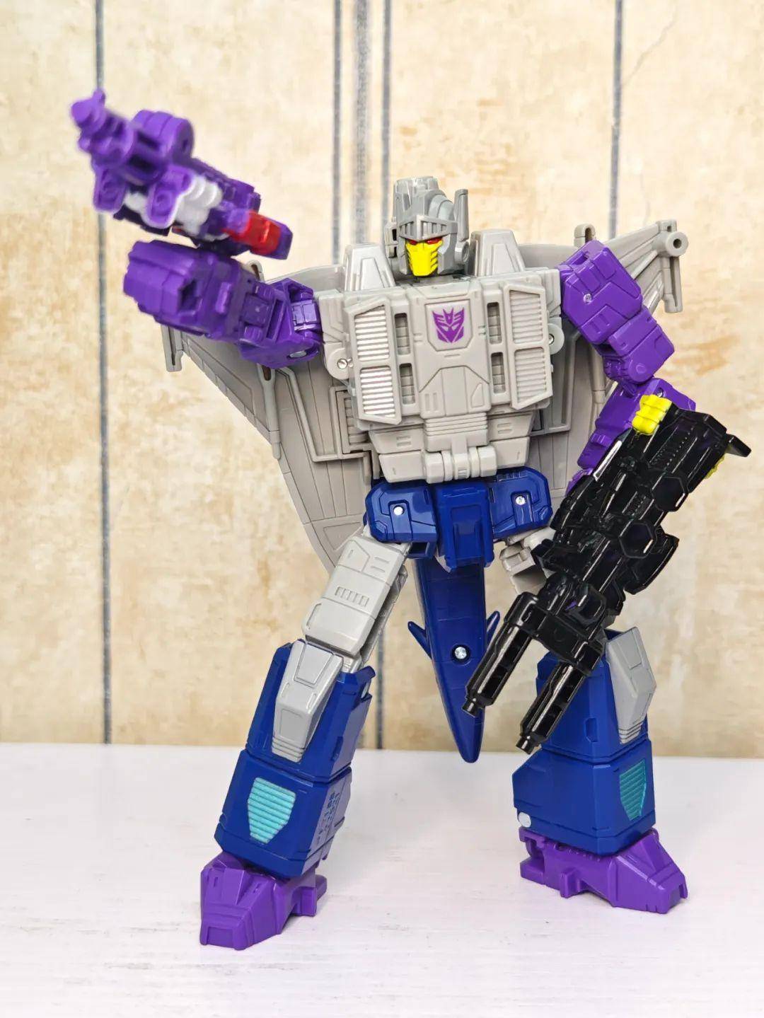 另一位是Zigzag,最合适的翻译可能是锯齿,但已经有霸天虎叫锯齿了,不如叫折线。他是个失败的战士和修理工,变形为双管静电步工具。他身上的黑色不是成型色,完全是涂装,从孔洞深处可以发现他本来就是一块紫色的零件,正因如此,把玩的时候要稍微注意一下掉漆的问题,虽然黑色补色很方便,但肯定不是原来这种光亮的效果了。他身上的甲胄刻画有武士的感觉,一只手臂上装着盾牌。