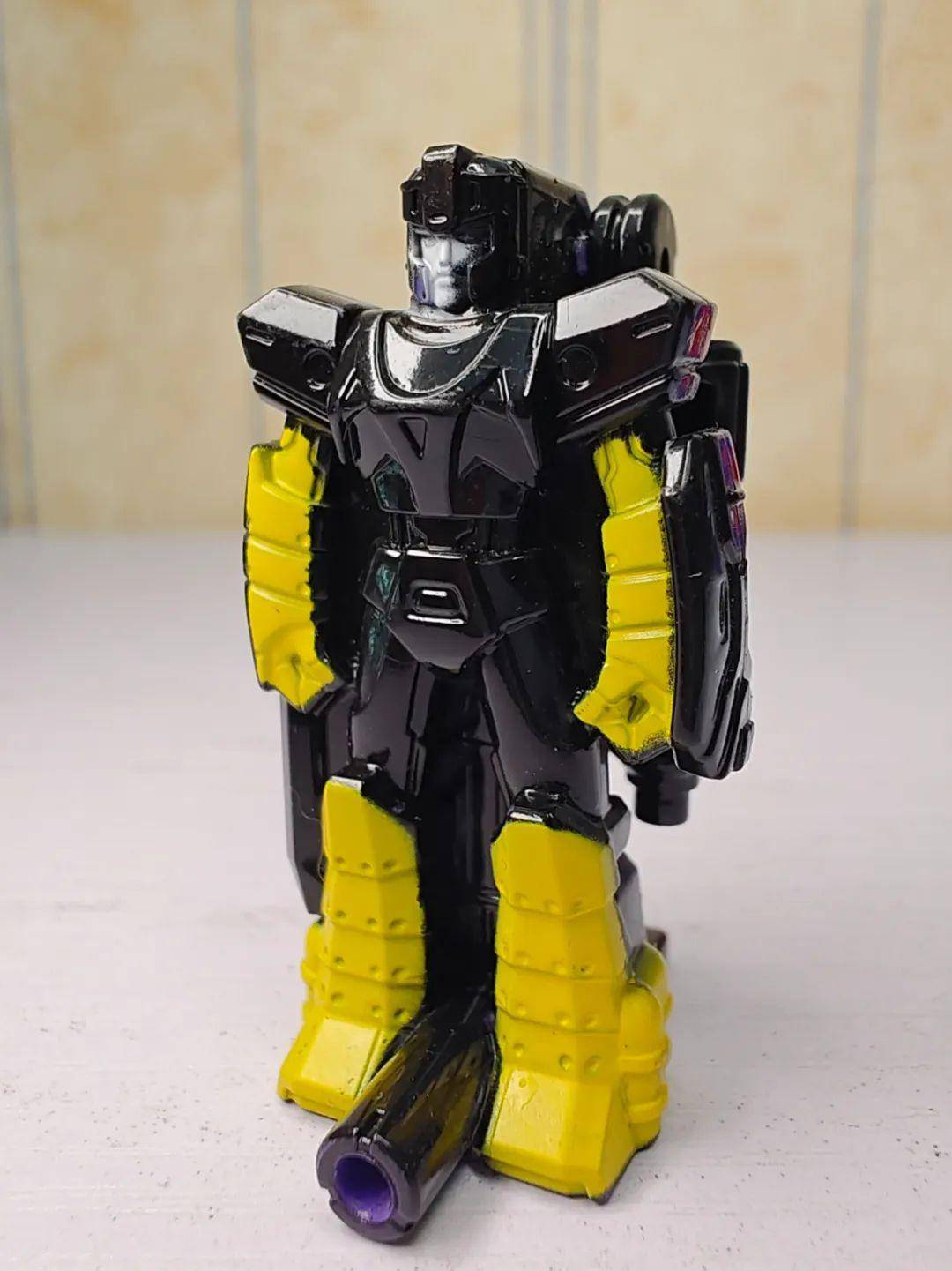 紫色的这位叫Sunbeam,可以叫光束,是位性格傲慢的家伙,可以变形外太阳能驱动强光发射器,在没有阳光时,威力会渐弱。虽然整个正面的刻画都依赖一体成型,但是也做出了一些细节刻画和不对称的设计,尤其是手上拿着的小工具还挺有趣的,可惜完全不可动。头雕有点终结者的气质,身材口的通用插桩在这个小人身上倒像一门身材炮。