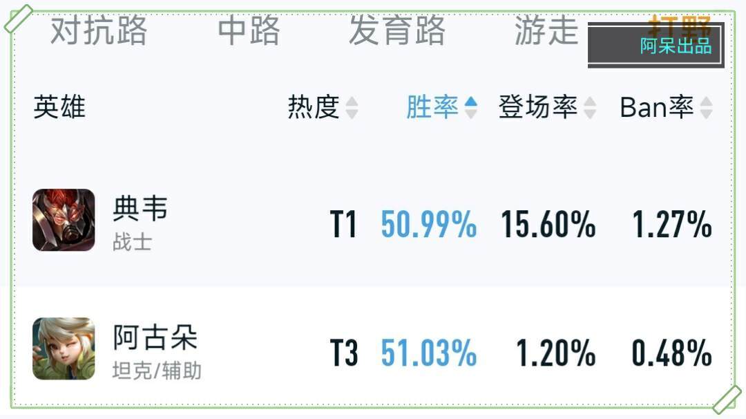 看一下全分段当中打野英雄的胜率排行榜,典韦的胜率不高也不低,刚好保持在50.99%之间,这个胜率确实是出乎意料,而且登场率还有16.7%,足以证明典韦这个英雄在全分段当中还是有一定热度的。