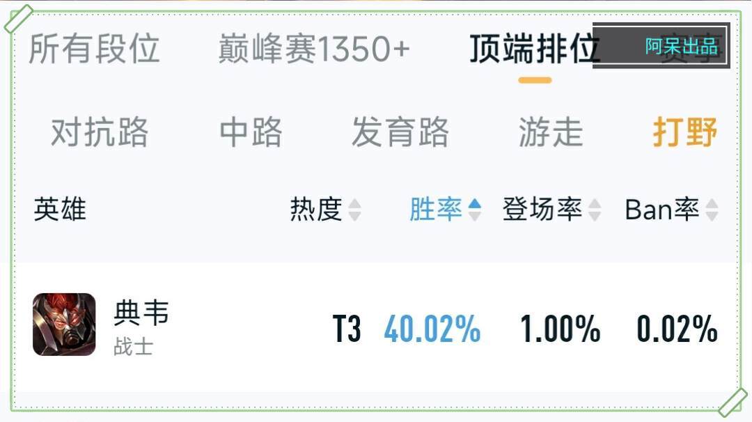 典韦在顶端排位赛的打野胜率数据排行榜中,仅有40%的胜率,倒数第1名,登场率也少的可怜,仅有1%,在出场率这么低的情况下,胜率却能够一直维持在40%左右,足以证明这个英雄的表现确实是存在一些问题的。