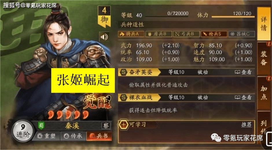 张姬每次普攻增加15武力,8次普攻增加120武力,可以说是越打越强。