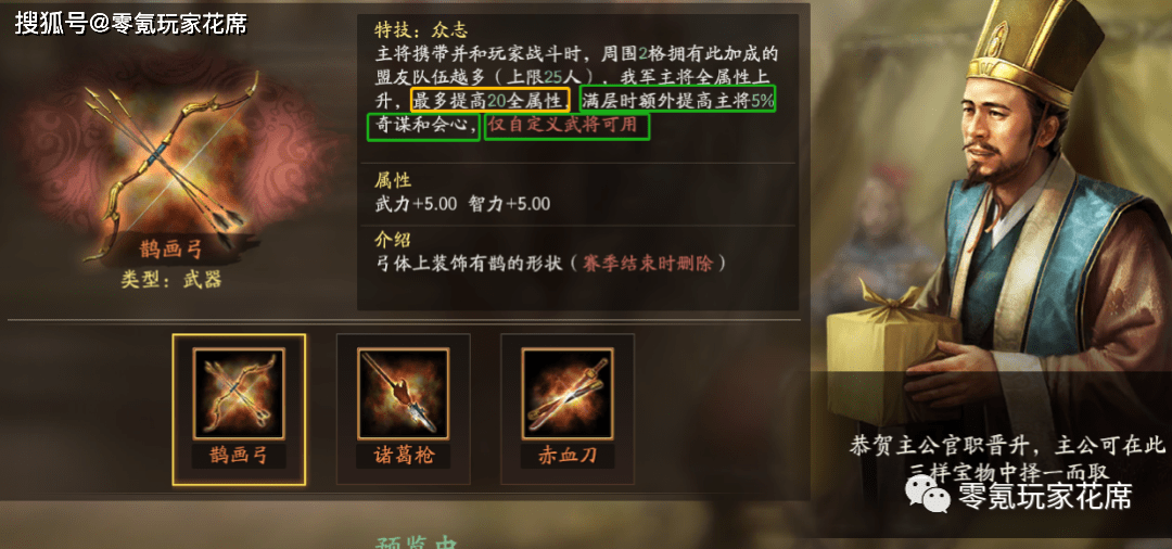 或者选择鹊画弓,冲九八或者守九八专用,增加20全属性,还能提高主将5%奇谋和会心。