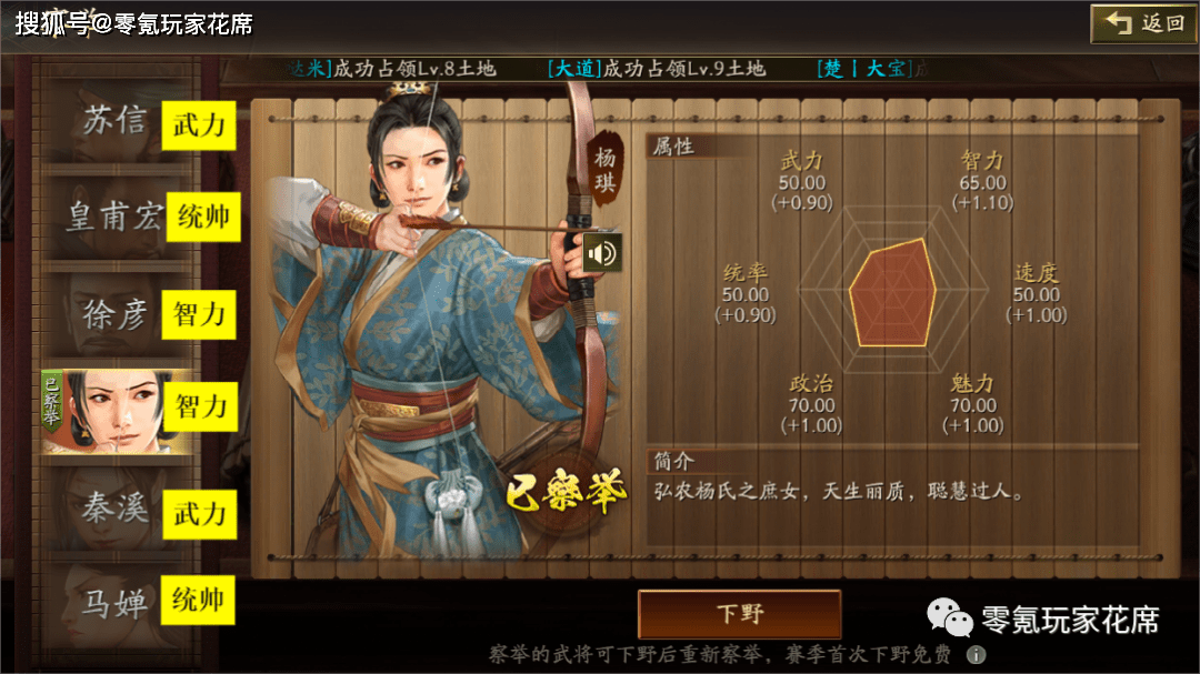 开局从6个武将中选1个武将,2个武力、2个统帅、2个智力,一般来说选女性比较好,方便后期玩黑科技。