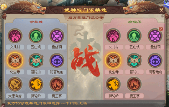 在禁选环节中,紫禁城、珍宝阁均禁用了对手化生寺、咒师普陀。由于比赛双方都没有携带其他恢复门派,所以这波禁选实际上封锁的“咒师体系”的阵容。