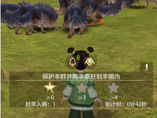 挑战开启后,孩子们需要在规定时间内尽量多的将羊赶入羊圈内,需要全体队员通力配合,一个人赶羊的话实在是太慢了,当您位于羊的附近时可以点击快捷驱赶按钮将羊进行驱赶,驱赶方向为少侠变身模型的正面朝向。期间会有狼来入侵,需要孩子们使用技能击败狼群保护羊的安全。