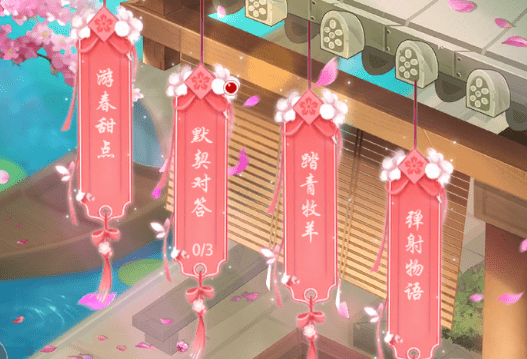 活动包含几个小活动。“游春甜点”,“默契对答”,“踏青牧羊”,“弹射物语”,以及“花间春闹商店”。