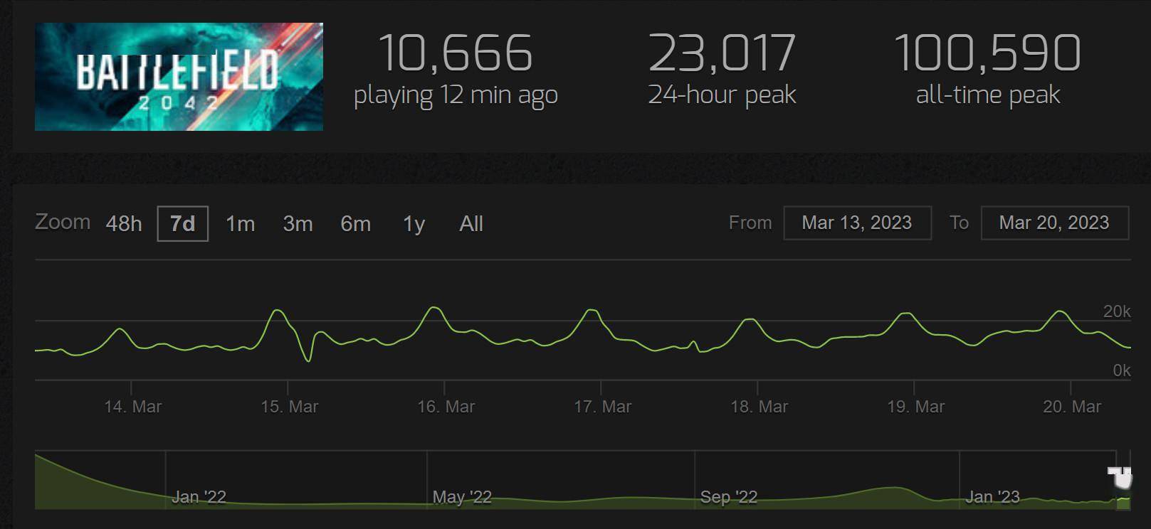 上周,《战地2042》在3月13日(周一)至3月16日(周四)在Steam开启了免费试玩,期间最高峰值为2.4万人。3月13日之前,《战地2042》Steam平均在线9000人左右,因此免费吸引了一些新玩家,但并不算太多。可能是EA在Steam搞过太多次试玩的缘故。