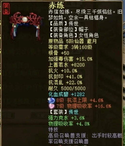 茵缘再续玩家分享自己的装备五件套,武器是六阶炼骨毒,衣帽都是五阶,其中衣服带蓝字强毒伤,帽子带高召特技!鞋子是四级人法步定,带强化曼陀罗!护身符是强毒伤加曼陀罗特技。