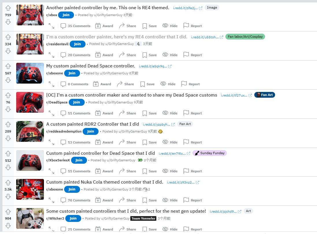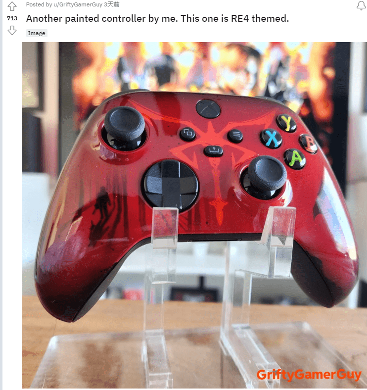 这个帖子受到了不少粉丝的盛赞,在被问到是用什么材料制作时,GriftyGamerGuy表示他使用2K 丙烯酸氨基甲酸乙酯将其密封,然后再将其重新安装到手柄上。在该作者的Reddit主页中,可以看到他为其他许多游戏也定制了专属的手柄,如《死亡空间》、《光环》、《质量效应》、《艾尔登法环》等等。