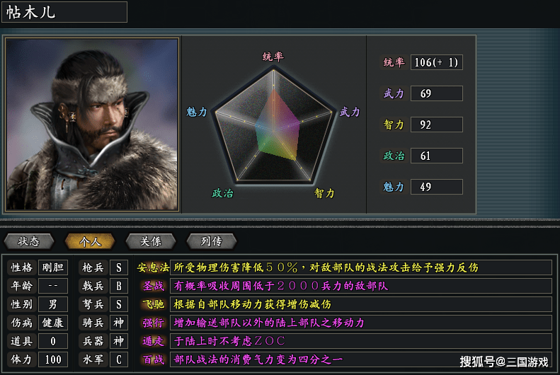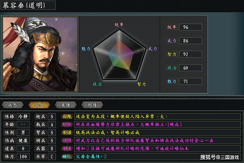 慕容垂的定位一直是物理输出和计略控制的文武双修设定,这个版本将他文武双修的设定提升到了极致。二阶特技军谋保证了他战法和计略的稳定成功率,三阶特技骁将,又将他的兵种定位到了弩骑。