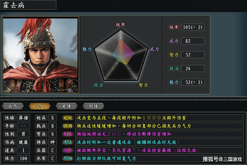 霍去病能够在这个版本被称为幻神的原因,主要就是因为这个超级输出能力,早早的就具备秒杀能力;在这个基础之上,自身还有一个自动的士兵补充效果,也就是骁骑特技的一部分能力,但是不要忽略骁骑特技的另外一部分能力,每回合提升霍去病的骑兵适性经验,如此一来霍去病就可以相对很快的将骑兵适性提升到圣等级,拥有了骑兵部队的 AOE 战法飞射,冠锐配合飞射战法,就形成了所到之处寸草不生的画面。
