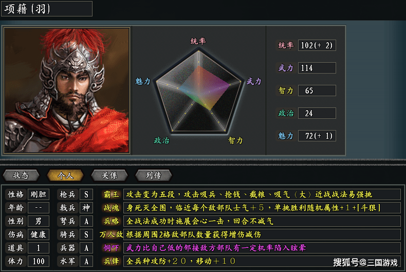 项羽一直都是游戏中非常强力的武将,只不过因为初始的统率数值没有办法突破 100 这个坎(兵败身死武将,有着演义加成等因素),所以在统率决定部队攻防的版本中,或多或少的都吃了一些亏,这也导致他总是容易被低估。