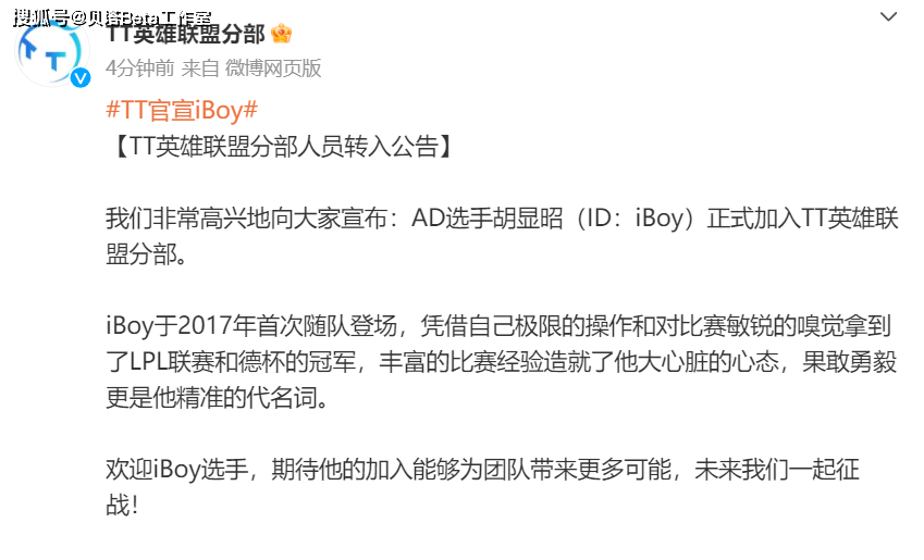 TT官宣的原文如下,表示iboy正式加入TT,并且称赞了iboy在过往职业生涯中的表现,认可了他的大心脏和敢打敢拼的心态,最后就是欢迎他的加入,期待他可以为TT带来更多的可能性。