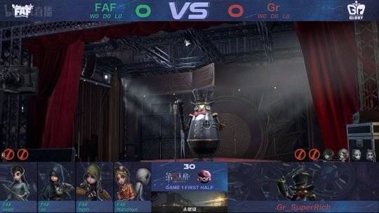 FAF的求生者选择了佣兵、先知、机械师、古董商;Gr的监管者SuperRich选择了邦邦。(BAN“囚徒”、舞女、玩具商、祭司)