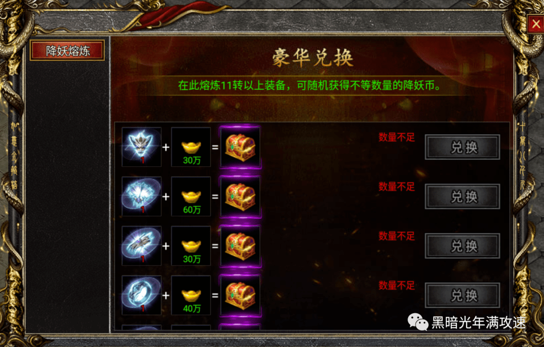 第三种方法通过降妖大使兑换获得,大家打到不想要的装备后,可在降妖大使直接兑换降妖币,11转、13转、14转、16转的装备都可以回收。
