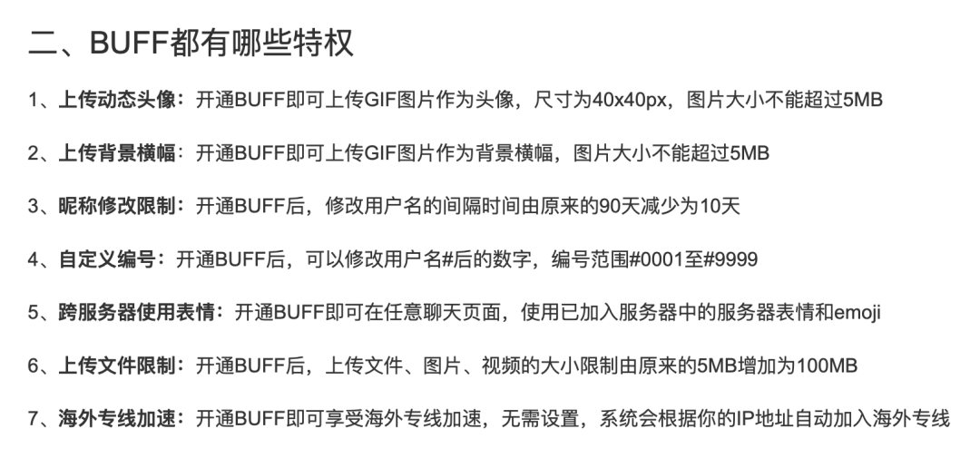 以KOOK为例,其付费会员体系名叫“BUFF”。单月购买BUFF的价格为19.9元,大约与长视频平台的会员价格持平。可当用户获得了BUFF,Discord类社区能提供的增值服务却实在不那么诱人,比如上传动态头像、上传背景横幅、缩短用户名修改间隔等等不痛不痒的功能。