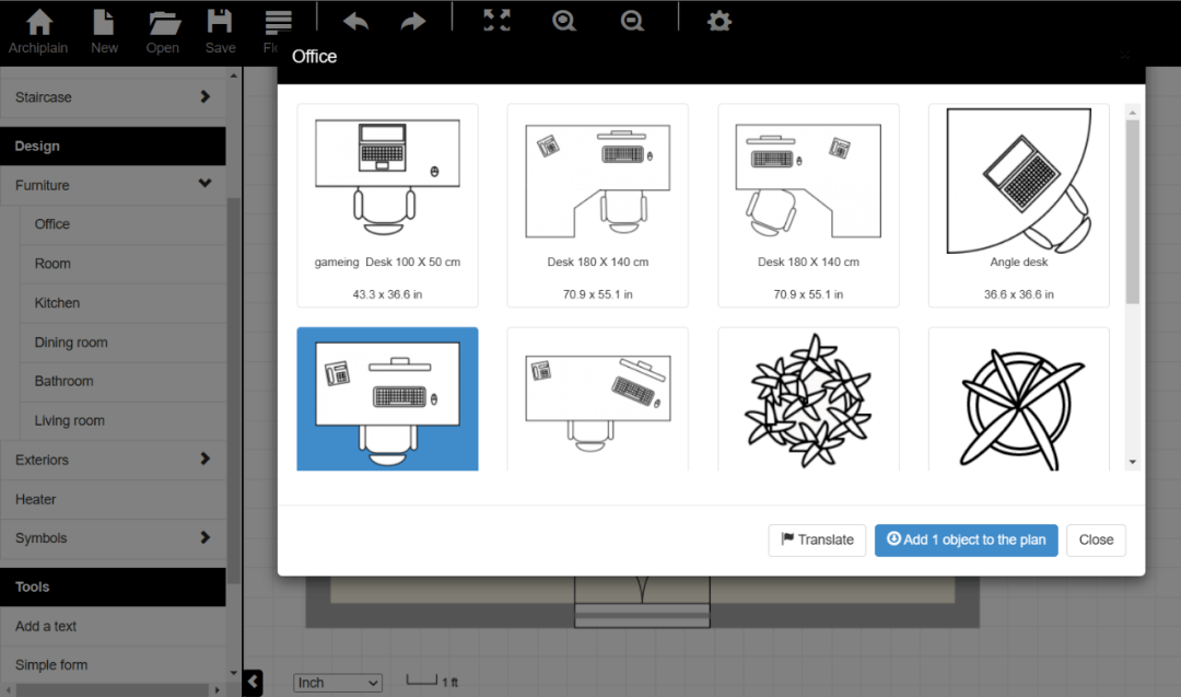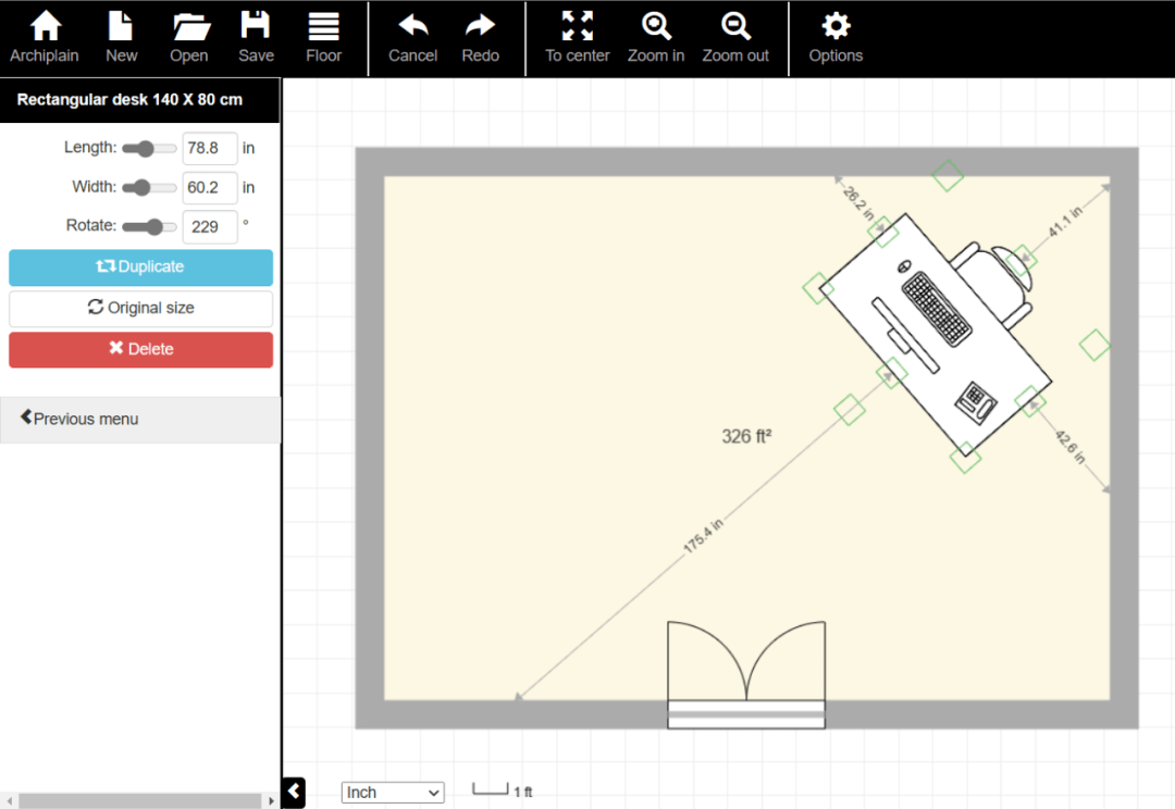 选中一款办公桌,再点击“Add 1 object to the plan(添加一个对象到平面图)”按钮返回主页面,点击鼠标左键即可添加一张办公桌。拖动办公桌可以将其移到任意位置,通过左侧Length(长)、Width(宽)和Rotate(旋转)等选项,可以调整办公桌的大小和方向(图31)。