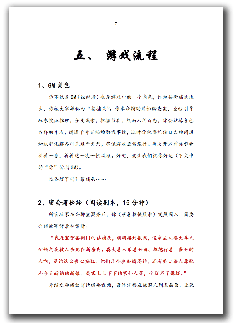 前文“剧本杀怎么玩”介绍了经典剧本杀游戏流程,我们可以在此基础上进行改造,以实现自己独特的游戏结构,然后为每一步操作编写脚本。所谓脚本,即GM需要说什么、玩家需要做什么等等的指示。这里以《画皮·两生缘》组织者手册中的一个片段加以说明。