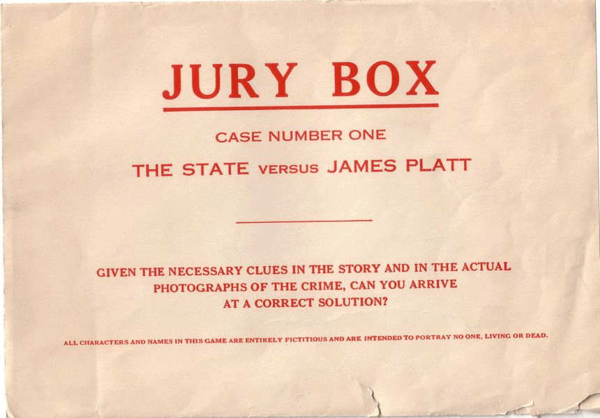 1937年,游戏《Jury Box(陪审团)》正式发行。这一游戏要求玩家作为陪审团成员审理六个案件,每个案件都带有故事、照片和标有“正确判决”的密封案卷,玩家根据这些资料进行推理,并给出被告有罪或无罪的判决方案。《Jury Box》被认为是谋杀之谜游戏和角色扮演游戏的前身,正是从这一游戏开始,正式开启了现代谋杀之谜游戏的关键元素——线索和证据(图3)。