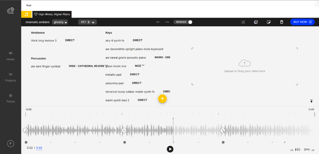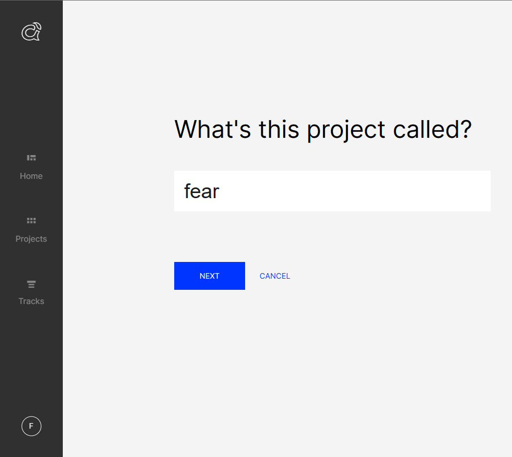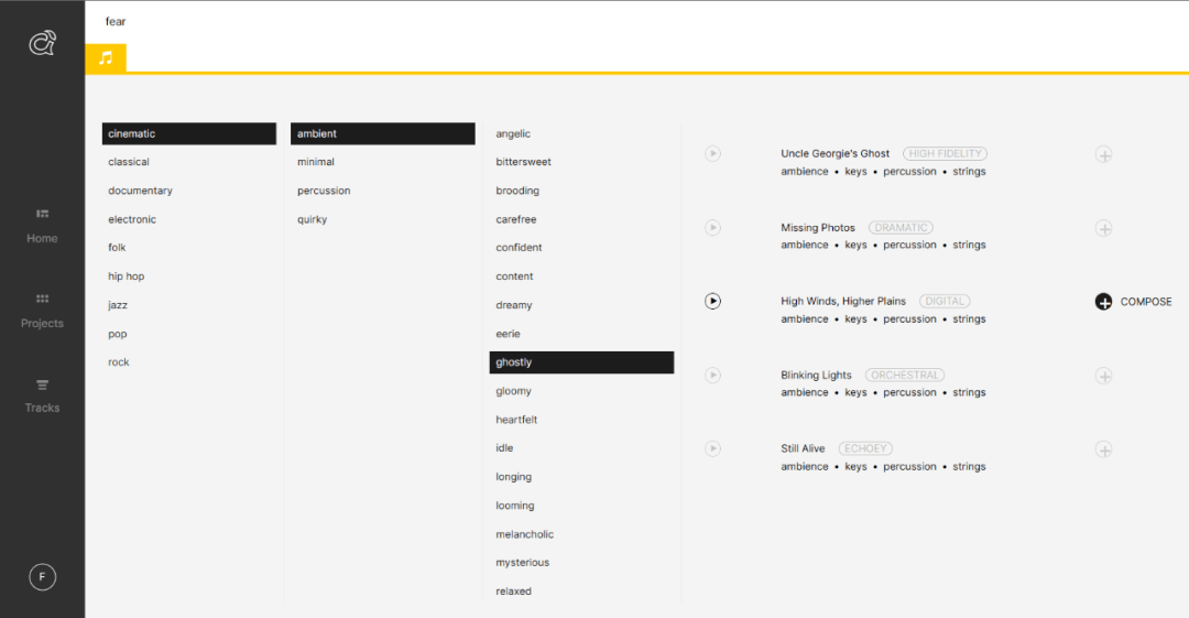 首先打开网页https://www.ampermusic.com,点击“GET STARTED”按钮,将会提示我们注册该网站账户。注册完成后登录,自动进入自己的首页。点击右侧“Create your first project from scratch(从头建立自己的第一个项目)”,开启创建向导。本文剧本杀示例《画皮·两生缘》包含“微恐”元素,我们不妨试试带有恐怖氛围的音乐,所以这里的名称设置为恐惧的英文单词“fear”(图34)。