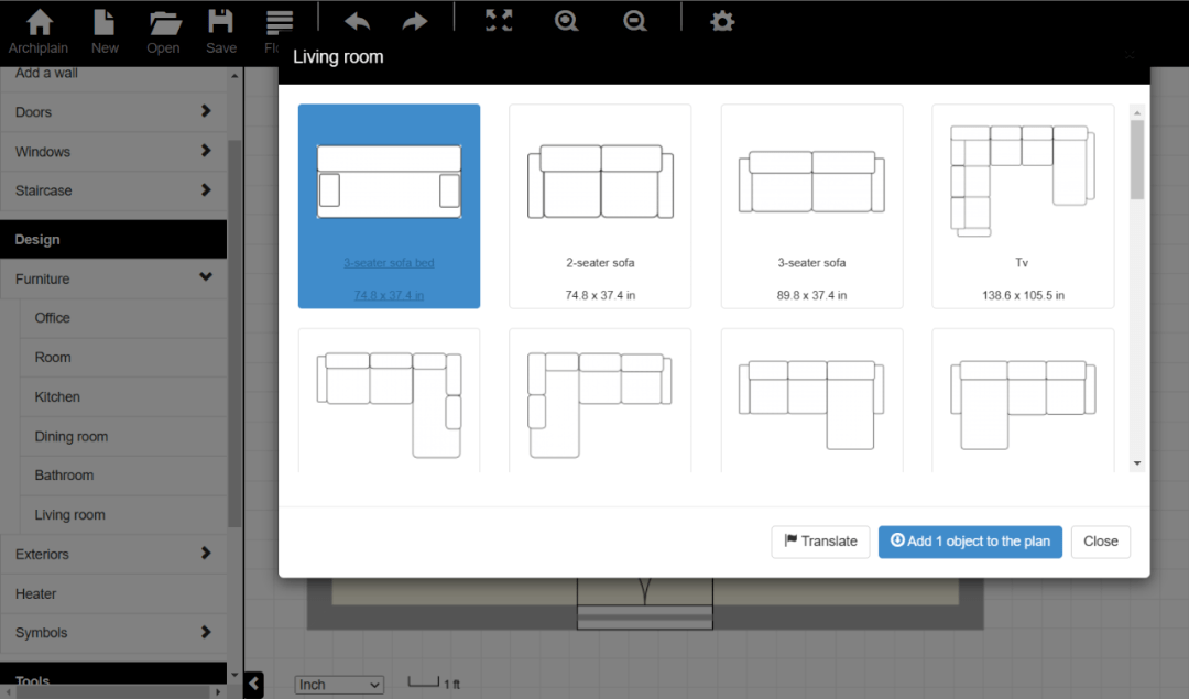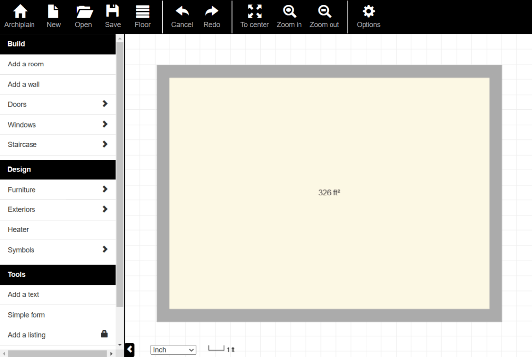 首先打开Archiplain的免费平面图页面(https://archiplain.com/free-floor-plan),点击“DRAW PLAN”按钮进入编辑页面,其上方包括New(新建)、Open(打开)、Save(保存)、Cancel(撤销)和Redo(重做)等常见功能按钮,页面左侧的功能区则提供了绘制平面图的各种工具。