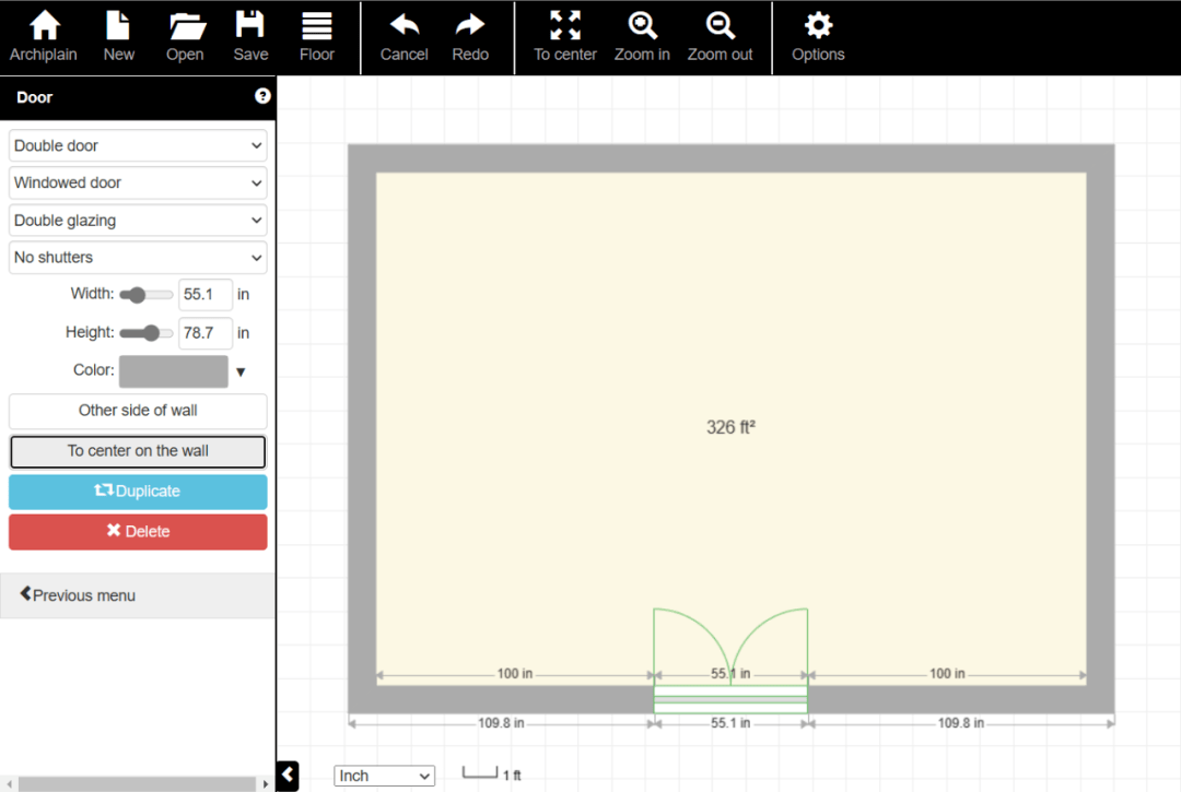 点击展开“Doors(门)”,选中其下的“Double door(双门)”,此时将光标移到房屋的边框上(墙),将显示出门的形状,点击确定,即可在墙上开出一道门了。此时左侧功能区变成了与门相关的选项。默认情况下门是开向外侧的,点击功能区的“Other side wall(墙的另一侧)”按钮,门即可翻转到内侧(图29)。