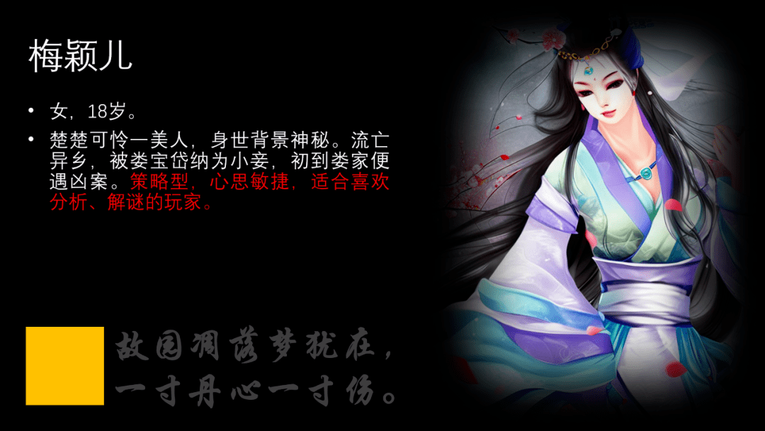 故事中的角色身份可以多姿多彩,诸如官人、捕快、富豪、奴仆、商人、店家、乞丐等等,但是游戏身份无非就是被害者、凶手、平民、侦探等几种,凶手隐藏在嫌疑人中。创建角色时一定要注意他们的游戏功能,比如凶手是可以说谎的,一般嫌疑人则务必说真话等等。无论人物如何设计,人物剧本中大多会包含以下几方面信息。