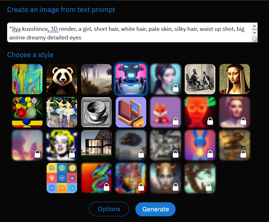 上述Prompt中,“ilya kuvshinov”是一个知名画师,这个关键词提示要模仿他的绘画风格;“3D render”提示3D渲染方式;接下来是对绘画主体的描述,一个女孩,白色短发,白色皮肤,动画风格的大眼睛等等;“waist up shot”提示的是构图,意指上身特写。