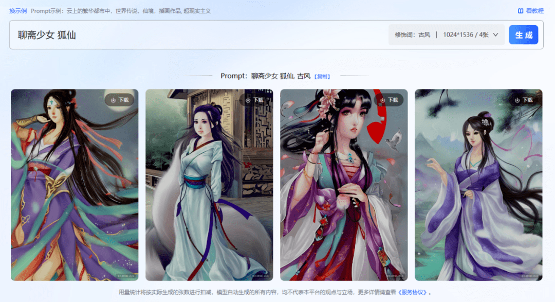 上面的方案涉及到专业软件的使用,还是有不小的门槛。其实现在AI绘画流行,我们只要给出所需画面的文字描述,即可轻松“画”出自己想要的作品。本刊第21期曾介绍过“文心大模型”的ERNIE-ViLG文生图工具,本例就用它来试试剧本杀《画皮·两生缘》中人物的绘制。